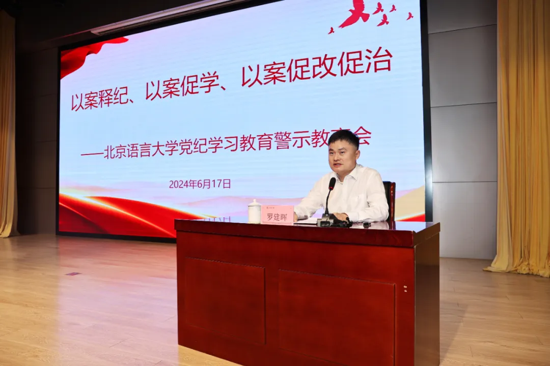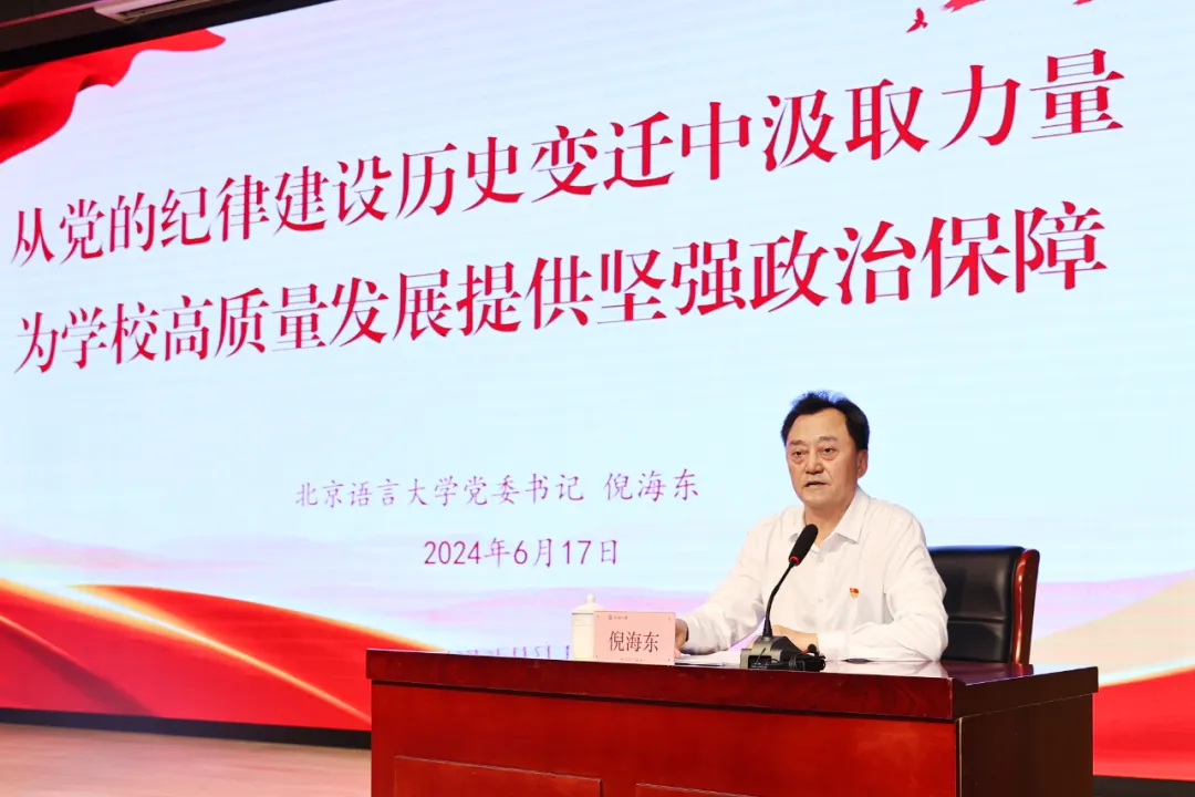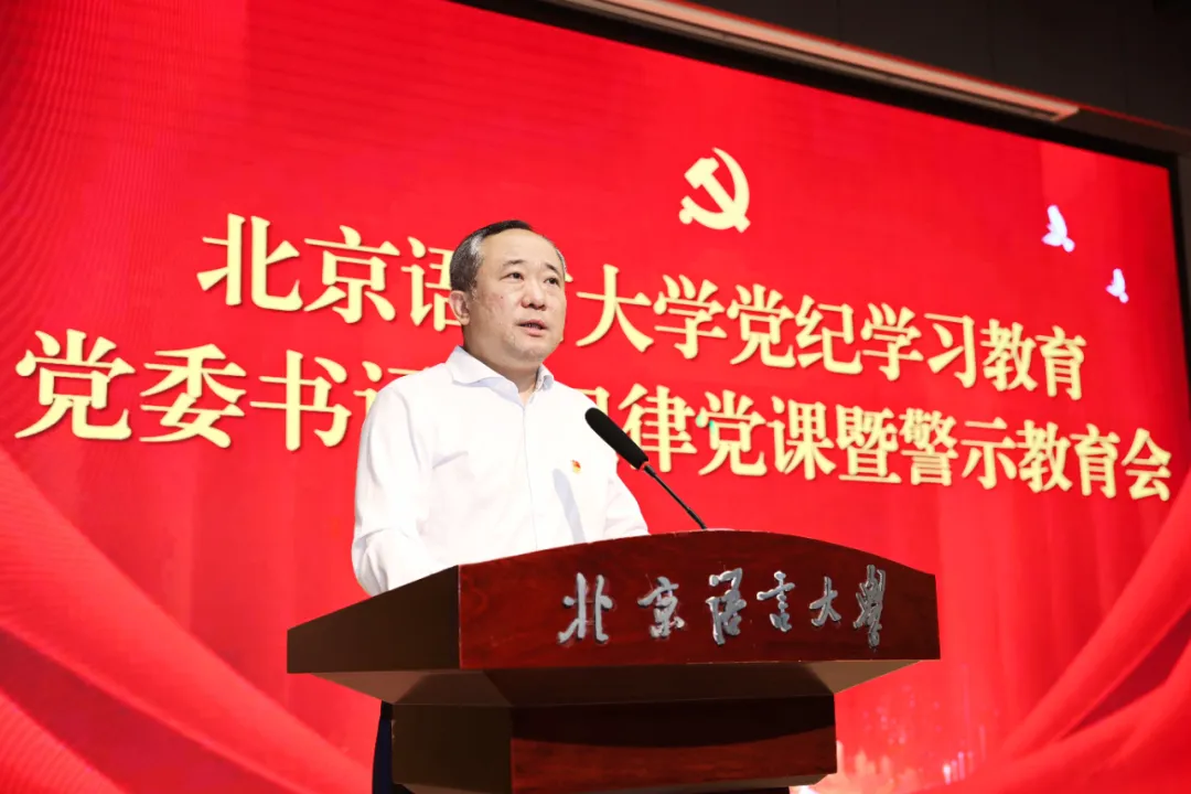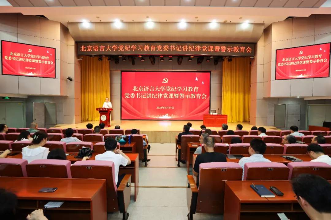 6月17日下午,北京语言大学在教一楼209报告厅召开党纪学习教育党委书记讲纪律党课暨警示教育会。教育部直属高校党建工作联络员翟志席同志到会指导,学校全体校领导、党委委员、纪委委员、全体中层干部、二级纪委书记(纪检委员)、教师党支部书记、学生党支部书记、各二级党组织党员代表参加会议。会议由党委副书记、校长段鹏主持。