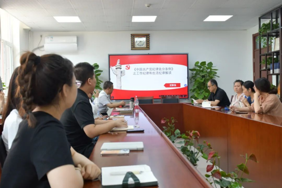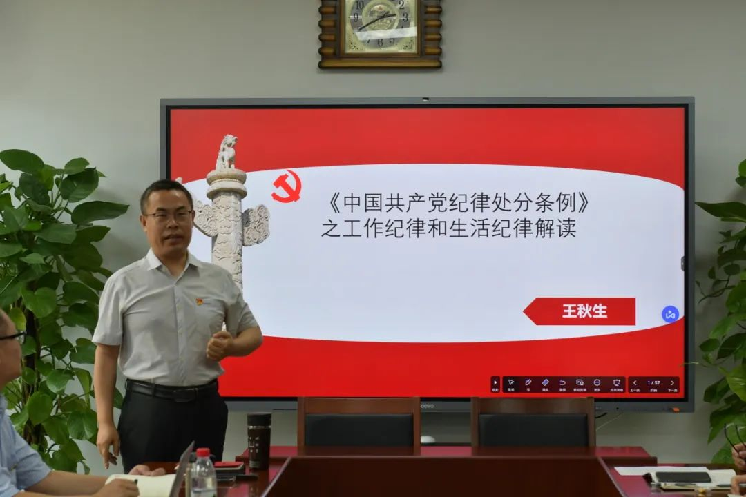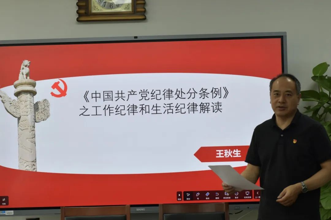 党总支书记王秋生首先从《条例》中的“六大纪律”这一核心内容开始讲解。党的“六大纪律”分别指政治纪律、组织纪律、廉洁纪律、群众纪律、工作纪律、生活纪律。六大纪律的遵守情况是巡视工作巡查的重点。在讲解过程中,王书记对“六大纪律”的定义及其各项守则做出了详细、贴切的解释。在此基础上,他也从反向角度出发,结合各种违反党的纪律的案例,向大家重点讲解了《条例》第十章《对违反工作纪律行为的处分》和第十一章《对违反生活纪律行为的处分》的内容。各项案例贴近生活实际,其中不乏涉及统计造假、考试违规、泄密、涉外工作违规、生活作风奢靡腐化、不重视家风建设、违背社会公序良俗等违纪行为,在场各位党员代表们纷纷表示,这些案例具有深刻的警示作用,自身以后将继续学习反思。